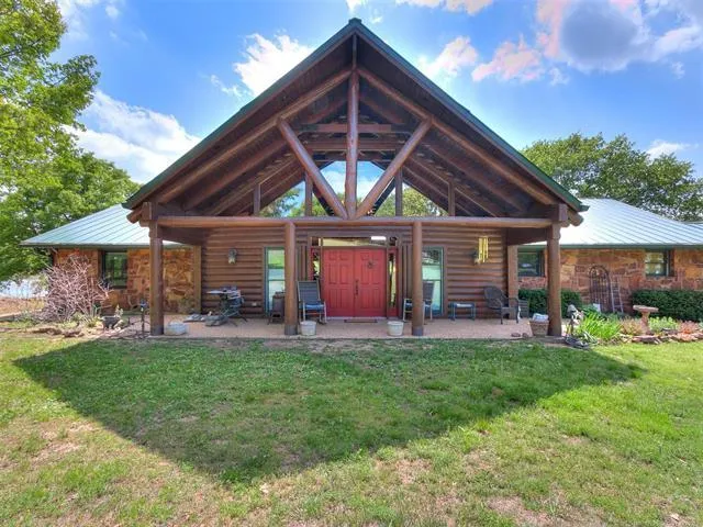 Your Hunting Oasis awaits you, this nature filled property is nothing short of Serenity & privacy! Gorgeous 3,746 Sq Ft modern 'A' frame log cabin nestled in the Osage Hills on 87 acres just minutes from downtown Bartlesville! Multiple shops (incl 1800 sq ft shop + others) and lean-tos on property for your outdoor hobbies and equipment. So much fun to be had... Fish and canoe on the 8-acre pond, walk right out of your front or back door and go hunting, or make this the most exquisite Wedding venue around! Endless opportunities with this one. House features vaulted & beamed ceilings in the great room with a lot of natural lighting and windows to show off the stunning views. Gourmet kitchen with granite countertops and a prep kitchen off to the side, open floorplan with new hardwood floors throughout the house, wood burning fireplace and don't forget about the loft. Enjoy dinner and sunsets out on the extra-large wooden deck overlooking the pond under your own bed of stars. Host your family/friends in the 2nd house where they too will enjoy the beautiful views of nature! Do not miss out on this one book your private tour today!