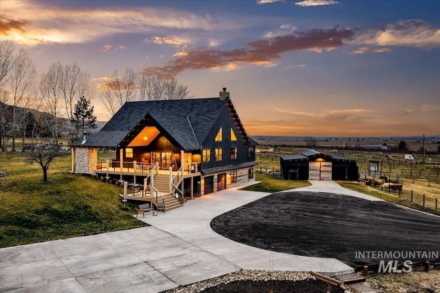 Over 8 usable, flat acres in the Emmett Valley surrounded by orchards, offering privacy, productivity, & the true Idaho lifestyle. With irrigation water rights and fertile ground, this property presents exceptional flexibility for farming, animals, recreation, or a home-based business. The 3,792 sq ft home features an open, light-filled floor plan with vaulted ceilings, a great room with stunning stone fireplace & expansive valley views. The spacious kitchen includes quartz countertops, an oversized island and walk in pantry. Main-level primary suite offers a dual walk-in closets, dual vanities, & a walk in shower & soaking tub. The daylight basement provides additional living space with a rec room, wet bar, & ample storage. Outdoor living shines with a wraparound porch & deck, covered patio, mature landscaping, fenced yard, pond, & raised garden beds. The property includes approximately 8 acres of water shares for irrigating pasture, with portions already fenced for all of your animals. Outbuildings add tremendous versatility, including a 3,000 sq ft steel-framed shop with concrete floors, 220V power, & its own septic ideal for equipment storage, vehicles (room for 14+), or a small business. A finished 1,220 sq ft ADU/guest house offers excellent potential for guest quarters, workspace, or additional living area, along with horse barn, chicken coop, and multiple storage sheds.