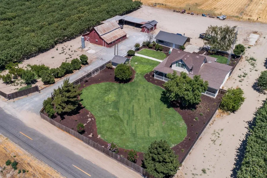 A rare opportunity to acquire a high income producing Pistachio Ranchette. Orchard was planted in 88 at 18'x15'. Irrigation is by the deep well via a micro jet system. TID flood capable as well. The five year income history averages over $78,000.00/yr. The lovely home is approx 1842sf w/3bdrms, 2baths & a wraparound porch. Home has been updated & boasts some beautiful hard wood floors, granite counters & stainless appliances. The large garage, 40x60 barn & income make this a must have!