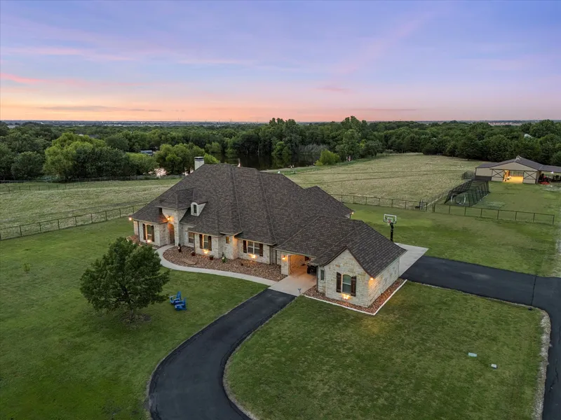 Welcome to your private retreat on over 8 scenic acres, where the charm of country living meets the convenience of city access. This beautifully maintained property offers everything you've been looking for- space, function, and serenity- just minutes from shopping, dining, schools, and major highways. This stunning custom home features a spacious and open layout, ideal for both everyday living and entertaining. Upon entry, you will find hand scraped hardwood flooring and a gorgeous stone accent wall. A dedicated office is located just off the entry and includes built-in bookshelves and additional storage. The gourmet kitchen boasts granite countertops, stainless appliances, and an oversized island. Tucked away, is the primary suite- featuring dual sinks, a soaking tub, and a separate shower. A dedicated game room provides the perfect hangout space for teens; complete with room for a pool table, media setup, or gaming stations. Step outside to enjoy the covered patio complete with a hot tub and a cozy outdoor fireplace. A spacious porte-cochere adds a touch of elegance and provides covered parking, in addition to the four car garage. Bring your horses or livestock- the property is already equipped with a 48 X 66 barn and plenty of pasture space, making it ideal for equestrian enthusiasts or small-scale farming. The generous sized barn offers endless possibilities- from a workshop and equipment storage to livestock or recreational space. Enjoy weekends fishing in the pond, surrounded by mature trees and open sky, offering both beauty and tranquility. Whether you're looking to create your dream homestead or simply enjoy a little extra breathing room close to the city, this rare property delivers it all!