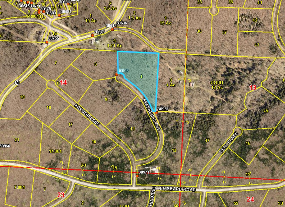 Coordinates: Nw Corner 38.23806, -93.21177, NE Corner 38.23800, -93.21021, SW Corner 38.23743, -93.21172 (Road), SE Corner 38.23628, -93.21031 (Road)