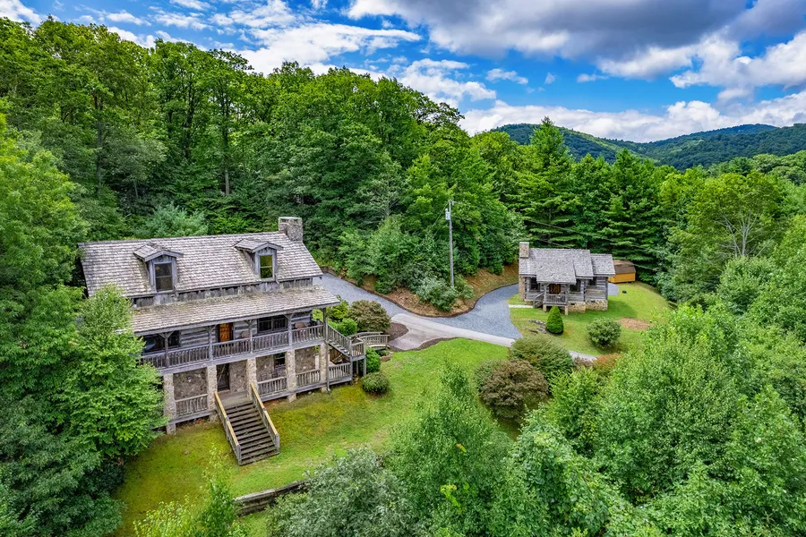 Step back in time in this rustic yet modern mountain retreat with 2 homes situated on over 8 acres with incredible long-range mountain views. The main house and guest house are custom-built with timbers dated from the 1800s and reclaimed from cabins from Virginia. The main house functions as a 3-bedroom with an office. Open concept living with a beautiful stone, wood-burning fireplace, vaulted ceilings and two lovely, covered porches to enjoy the mountain views. Upper level finds the primary bedroom with a full bath and cedar-lined closets. The lower level offers a great family room, a large bedroom that would make a great bunk room and a full bath. The lower level has its own outside entrance with a great covered porch. Moving on to the quaint guest cottage, which is a few steps from the main house. Walk into the cozy den with a stone gas fireplace with custom wormy chestnut mantel, wel...