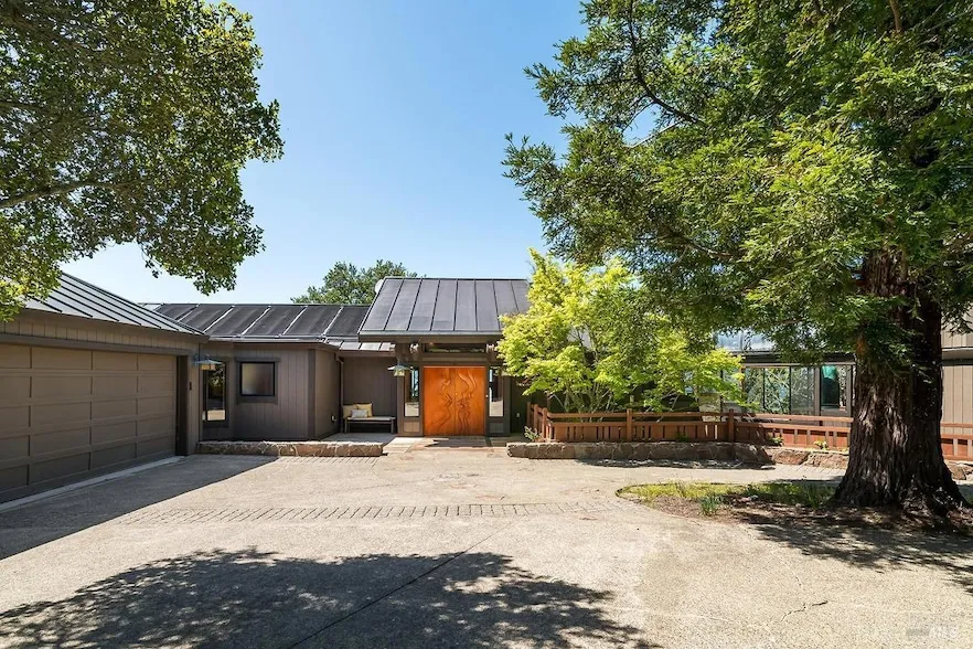 One-of-a-kind, custom master-built estate on 8.6 acres. A true tribute to the harmony of humankind and nature. This 5BR/6BA destination legacy home offers total privacy, incredible grounds, a breathtaking pool, a separate pool house, panoramic views and miles of hiking, biking and riding trails. With upwards of 7500 sq. ft. (6595 per tax record), this light-filled, window-rich home is solid, dramatic and welcoming, designed for every experience. Circular driveway, hand-carved walnut doors and a full copper roof set the tone. Approx. 1,000 sq. ft. main-floor primary suite with two fireplaces, sunny Ipe deck, walk-in closet with built-ins and a meditation/workout room. The primary bathroom offers a domed ceiling, natural light and spa-like ambiance. The lower level features a large playroom, three generous bedrooms, three full bathrooms, laundry, wine storage, art space, workshop, and a grand office with separate entrance. Finished in 1994 and once owned by Dr. Dean Edell, the home offers direct access to China Camp's expansive trail network. Bay views are just across the way, connected by a network of hidden paths that make this setting feel like a private sanctuary. This is a destination property for the discerning buyer who values privacy, top craftsmanship and art.
