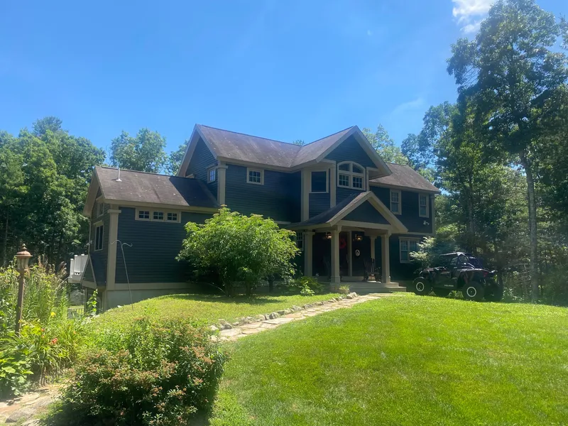 If it is privacy you are looking for, this may be the one! Come check out this beautiful, custom contemporary colonial. This home sits well off the road accessed by a long, paved driveway. There are plenty of windows to let in natural light and provide views of the wooded property. Through the front entry, the center hall leads to a light filled sunken living room with maple hardwood floors. The eat-in kitchen has stainless steel appliances, granite, and vaulted ceilings. There is a 1st floor bedroom as well and a first floor bath with custom shower. Upstairs, there are two more bedrooms and a custom bath with a large, tiled shower stall and separate claw foot soaking tub. Each of the two floors have a recently rebuilt composite deck. The walk-out lower level offers a 4th bedroom along with another room which could be used as a gym area, den, or office. The home features a LP whole house generator and outdoor furnace which heats the entire home with wood. The exterior clapboard was recently replaced, and there is even a sauna house!