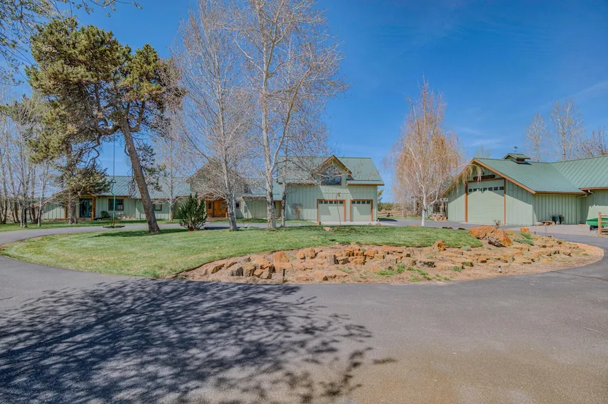 8+ acre gated property with 660+ feet of Little Deschutes riverfront, stunning Cascade mountain views, and no HOA fees. The home features 4300+ sq. ft. of living space with two primary suites, each with incredible views. The entry boasts heated tile floors and a handcrafted log stairway leading to a 20x16 loft. The great room has vaulted ceilings, floor-to-ceiling windows, and a propane rock fireplace. The chef's kitchen includes granite countertops, a 6-burner cooktop, Sub-Zero fridge, and more. The attached pool room has a jetted spa, swim spa, and space for workout equipment. The master bath offers a jetted tub with a view and a dual-head steam shower. Solar shades adjust for sun control. Two wells and on-demand water heaters ensure comfort. The second suite has a kitchenette and fireplace. The 4600 sq. ft. shop includes an RV garage, woodworking space, storage loft, and horse stall. The property features irrigated, landscaped yards and a riverside oasis with a seasonal dock.