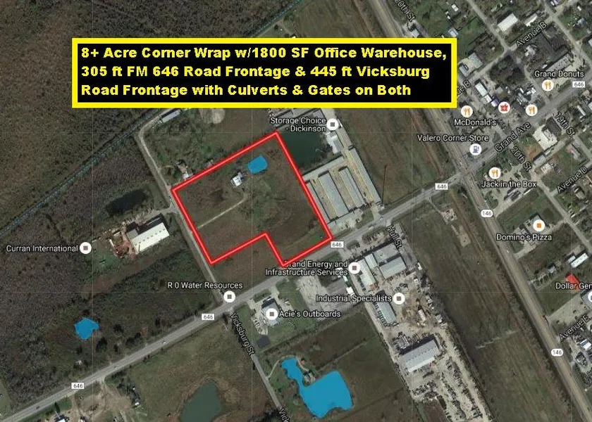 8+ Acre Corner Wrap by TX-146 has 1800 SF Metal Warehouse w/800 SF Office, Septic System, Retention Pond, 305 ft FM 646 Road Frontage & 445 ft Vicksburg Road Frontage w/Culverts & Gates on both. All Utilities Available! Baycliff MUD Water! League City Proposed Sewer. TX-99 (Houston's 3rd Loop) will span 180+ miles connecting League City-Katy-Tomball-Baytown (See Map)! TX-99 is proposed to use FM 646 to connect I-45 to TX-146. Preliminary Engineering Study Includes Soil Survey w/Drainage & Detention Studies. Zoned General Commercial. Perfect for Retail Center, Self Storage or Office/Warehouses, Billboards. Texas City ETJ. Hard Corner Also Available For Sale. 24-Hour Notice to Schedule Appointment. Listing Agent Must Accompany! Contact Credit Union for Loan!