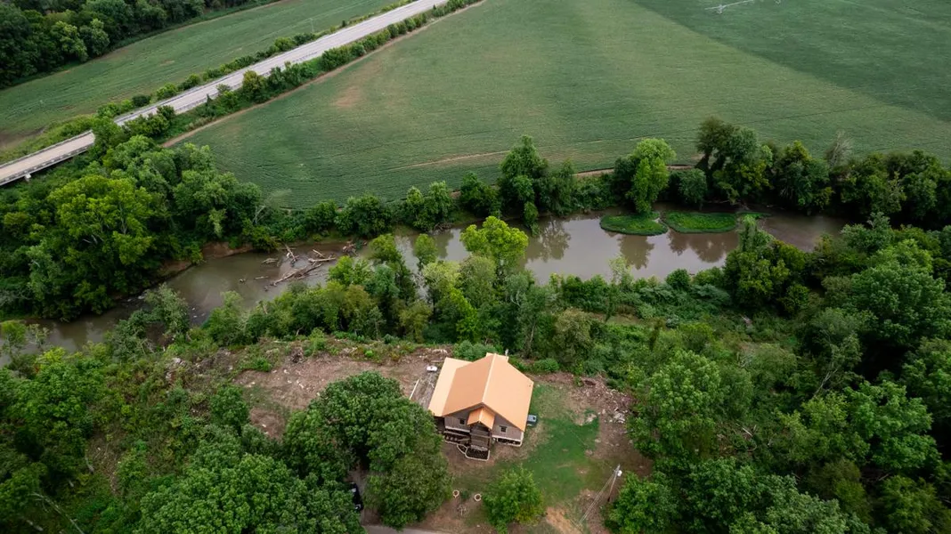 This custom A-frame house features 2 BR/2BA & 1772 sf of space, situated on +/-8 acres along Richland Creek at the end of a private road. Recently remodeled, it boasts a new metal roof. Dual road frontages provide easy access and pastureland for animals. The spacious living room is equipped with durable laminate flooring, high vaulted ceilings, and a ceiling fan. The kitchen includes an island and matching stainless steel appliances. The main level hosts 1 bedroom and a 3/4 bath, while the master suite upstairs features a separate shower and jacuzzi tub. Perched atop a hill, the 2nd story covered deck is the perfect place to relax with a cup of coffee & take in the expansive natural scenery.
