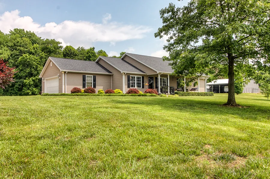 Country living! 7.86 total Acres 2300+ sq ft, 3 BD, 3 full Bath home with 2 living areas, separate laundry room, 2 car attached garage, 2 car detached garage-shop, port with stalls for rec vehicles, 8 dog run kennels with a running area. The front porch is the perfect view of the 2 Ac lake. Watch for wildlife and birds from the front window!