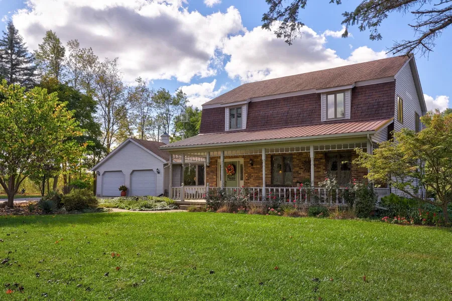Discover the country retreat you have been waiting for. Tucked away on approximately 8 private acres, this original-owner home offers peace, privacy, and a true connection with nature. Set back from the road and surrounded by mature trees, established landscaping, and a tranquil water feature, you will enjoy daily visits from deer, turkey, and countless songbirds. At first glance, a spacious covered porch welcomes you home. Inside, immaculate hardwood floors flow throughout leading you to the heart of the home, a large family room and an inviting eat-in kitchen, perfectly complemented by a formal dining room. Just off the kitchen is a full bathroom with a walk-in tile shower, while the living room, anchored by a custom stone fireplace, provides the ideal place to unwind and relax. A 225 sq. ft. four-seasons room, wrapped in windows, offers panoramic views of the property and an ever-changing display of wildlife. Upstairs, a beautiful oak staircase leads to four bedrooms, including a spacious primary suite, along with a second full bath. The lower level adds even more potential with a partially finished basement and a second fireplace, ready to become a recreation area, media room, or additional living space. For the outdoor enthusiast, hobbyist, or small business owner, the exterior amenities are exceptional. A 40x70 barn provides abundant storage, while a 20x30 climate-controlled shop features a covered porch, roll-up door, and a fully finished second floor, complete with its own private drive and parking. A third climate controlled outbuilding offers flexible space for a studio, workspace, or additional storage. This property must be seen to be appreciated. Offering an unmatched combination of comfort, seclusion, and natural beauty, it is a rare opportunity to experience the serenity of country living without compromise. Whether you are seeking a family home, hobby farm, or private retreat, this one-of-a-kind property invites you to live, work, and unwind in perfect harmony with nature.