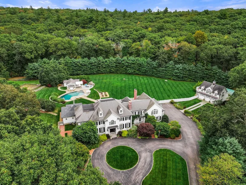 A rare country compound secluded on 18± lush acres, this custom-built Georgian-inspired residence is gracefully striking in a picturesque setting where sweeping lawns encompass a resort-like oasis with pool, pool house, outdoor kitchen and fireplace across from a carriage house with upstairs living quarters. Inside, the welcoming home flows easily from room to room and from inside to the outdoors in a comfortably elegant environment with a fresh refined style that transcends time. In the sizeable floor-plan, the atmosphere is inviting and understated with 3 fireplaces and beautiful millwork in deftly designed rooms for effortless living and entertaining. There is a stunning vaulted entertainment/fitness room plus a voluminous chef’s kitchen with casual dining/sitting areas, bar and butler’s pantry. Upstairs/downstairs family rooms. Luxurious primary bedroom suite featuring 2 dressing rooms and 2 baths. Lower-level recreation areas with kitchenette. Garages for 6 cars.