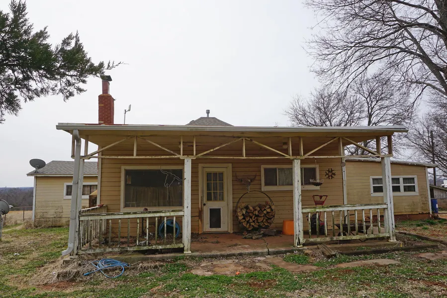 80 secluded acres +/- just off of the highway with easy access to Shawnee and on to OKC metro. Older 3 bed, 2 bath home with a cowboy rustic feel, great for the weekends or fixing up. Kitchen has ample cabinets, a cozy dining nook and hardwood floors. Rustic built in bar complete w/ sink. Large utility room w/ washer dryer hookups.