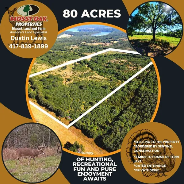 Pomme De Terre Lake; well known locally for its largemouth bass, crappie and white bass fishing. The lake has wider acceptance as a premier Muskie lake. This beautiful 80+\- acre property is short distance to lake access and also adjoins the Sentinel Conservation Area which is to the north. It features a private gated entrance, nice rolling hills and an abundance of wildlife including deer and turkey that can often be seen. Whether they're crossing through the property to go to the Conservation land or back to the lake on the west, you're sure to always enjoy the views. You can also enjoy miles of trails through the Corp land bordering the lake which allows access for horseback and bike riding, hiking or bird watching. There's more land available adjoining this property if you're interested in buying a larger tract. To find out more about this property and others call or text Dustin Lewis at 417-839-1899 or email at Dlewis@mossyoakproperties .com