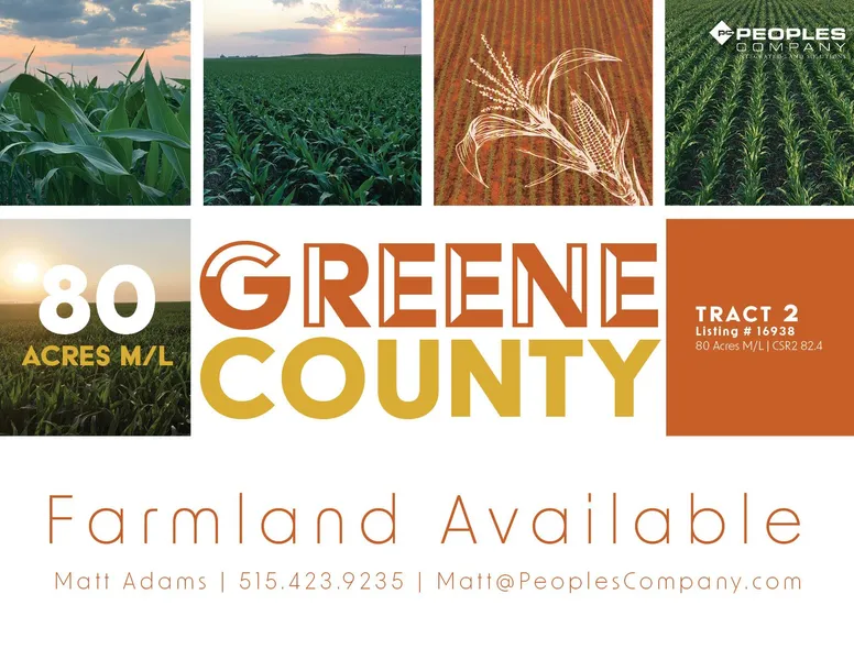 Greene County, Iowa Farmland Available- Peoples Company is pleased to present 80 acres m/l of prime Greene County, Iowa farmland. This tract is located on L Avenue south of Jefferson, Iowa; north of Bagley, Iowa; and in Section 23 of Greenbrier Township. This nearly 100% tillable farm consists of 78.30 FSA cropland acres with a CSR2 soil rating of 82.4, which compares to the Greene County average of 78.3. The primary soil types on the property include Canisteo clay loam, Clarion loam, and Nicollet loam.