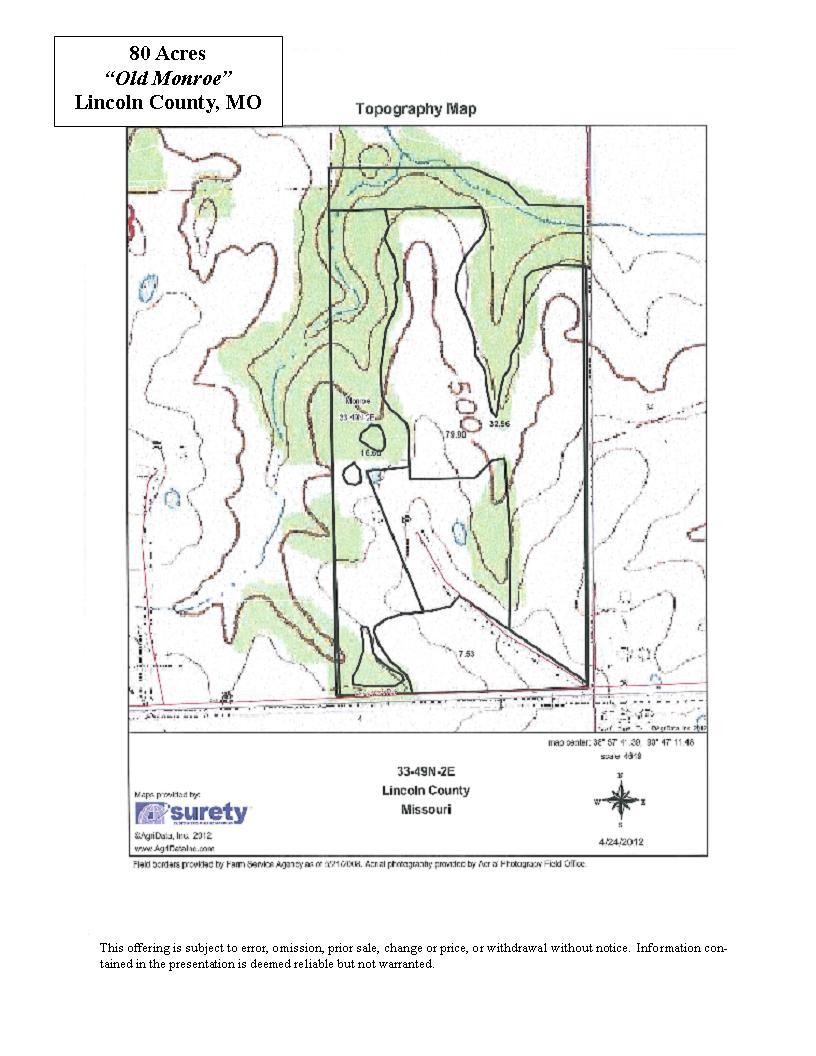 An 80 acre cattle farm in Old Monroe, Missouri, Lincoln County. This property features 50 acres of rolling pasture, fenced and cross fenced, 30 acres scattered woods, lake, and 2 cattle ponds. The residence on this property is a 3 bedroom, 2 bath, all brick ranch home with a 2 car garage. The outbuildings on the farm are a 40x50 cattle barn with lean-to, working pins, and a 50x30 pole barn. This property is only 10 minutes from St. Charles County, and within easy driving distance to the St. Louis Metropolitan Area.