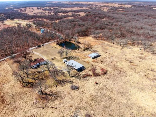 Ranch living! Bring your livestock. 80-acres m/l fenced & cross fenced to accommodate, & plenty of pasture for grazing. Property is the perfect mix of pasture & timber featuring two stocked ponds, loafing sheds, 30 x 60 barn, cellar, & even an old stagecoach stop. Enjoy breathtaking views for miles since this property is one of the highest points in Okmulgee County. House features an inviting living room, 2 beds, 1 bath, eat-in kitchen, den, & inside utility.
