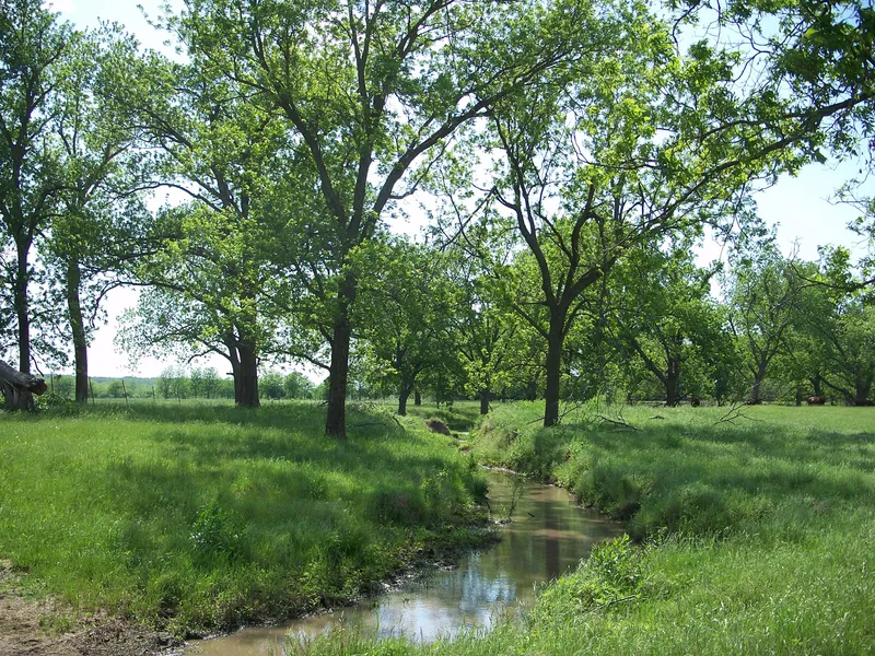 Property features include electric, rural water, water well, barn, machine shed, and cattle pens with working chute. Property is mostly open bottom land in Bermuda grass, with a small creek meandering through, and a mature native pecan tree grove.