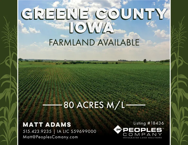 Greene County, Iowa Farmland Available! Peoples Company is pleased to represent 80 acres m/l of high-quality Greene County, Iowa, farmland located northwest of Bayard, Iowa. This highly tillable tract consists of 76.13 currently tillable acres m/l and a CSR2 soil rating of 81.4. Prominent soil types include highly productive Clarion loam and Nicollet loam. The balance of the tract consists grass terraces and grass waterways. The farm is situated in Section 28 of Willow Township, Greene County, Iowa.