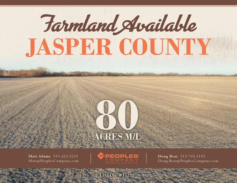 Farmland available in Jasper County! Property consists of 80 gross acres m/l with 73.92 NHEL FSA cropland acres of which 70.00 acres are currently in row crop production carrying a CSR2 rating of 64.6. A wetland determination has been completed on eastern 60.65 acres and was deemed Prior Converted (PC) allowing for additional drainage tile to be installed without any restrictions and is in progress on the western 14.24 acres. Indian Creek meanders through the southwest corner of the property and tile can be taken to daylight through this creek or by the drainage ditch. There has been rip rap installed along the outer bank of the creek bend to stabilize the bank and reduce erosion.
