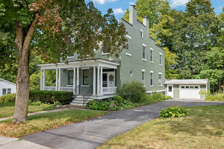 Welcome to Elm & Easel — a distinguished Late Federal-style townhouse accented by a graceful Colonial Revival porch, built in 1845 and cherished by artists for more than half a century. Standing proudly on a corner lot in the heart of Ballston Spa’s historic district, this residence offers the quiet beauty of a classic home blended with the vibrant rhythm of village life. Stroll to cafés, galleries, and boutiques along tree-lined streets, or simply savor the architectural character of one of New York’s most charming small towns. Life here means morning walks for coffee, afternoons exploring antique shops, and evenings on your wide front porch, a timeless space for watching the neighborhood pass by. Inside, the home reveals its artistic soul: soaring ceilings, oversized windows, finely preserved millwork, and dramatic floor-to-ceiling gilded mirrors that reflect the elegance of the 19th century. Both the family room and living room feature wood-burning fireplaces, creating warm, inviting spaces for gatherings or quiet evenings. The kitchen is the true centerpiece — a chef’s delight outfitted with a Vulcan-Hart 6-burner gas restaurant range beneath a custom black hood, complemented by a large island with stainless sink and under-cabinet lighting for modern function. Across from the range, floor-to-ceiling built-in shelving adds both rustic charm and historic character, balancing the kitchen’s contemporary upgrades with its timeless soul. A pantry with laundry facilities adds clever convenience while preserving the home’s historic flow. Also on the main level, a versatile space functions as a first-floor office or optional bedroom, complete with a full bathroom, ideal for those seeking a main-level bedroom option. From the kitchen, step out onto the back porch, where mornings bring the quiet company of songbirds and evenings invite visits from neighborhood wildlife; a peaceful retreat just steps from the heart of the village. Upstairs, you’ll find four spacious bedrooms and an office with walk-up attic access and deep closets in most rooms. One bedroom features its own fireplace, adding charm and warmth, while the primary suite includes an ensuite with a classic clawfoot tub. A second full bathroom has been updated with a stand-up shower and built-in storage, blending modern convenience with historic character. Thoughtful restorations, from repointed chimneys and brickwork to fresh exterior paint, a renewed driveway, and reinforced foundation, ensure this nearly 180-year-old home endures for generations to come. Accessibility upgrades, including a vertical platform lift in the garage, a front door ramp, and a stair lift off the kitchen, make the home welcoming to all. Adding to its appeal, Elm & Easel is exceptionally well-situated: just 15 minutes to the Saratoga Springs Amtrak station (with direct service to New York City), 3 hours by car to Manhattan for those seeking a historic village retreat with quick city access. More than an address — it is a piece of Ballston Spa’s story, a canvas of history and art, and a rare opportunity to live where heritage and village life meet