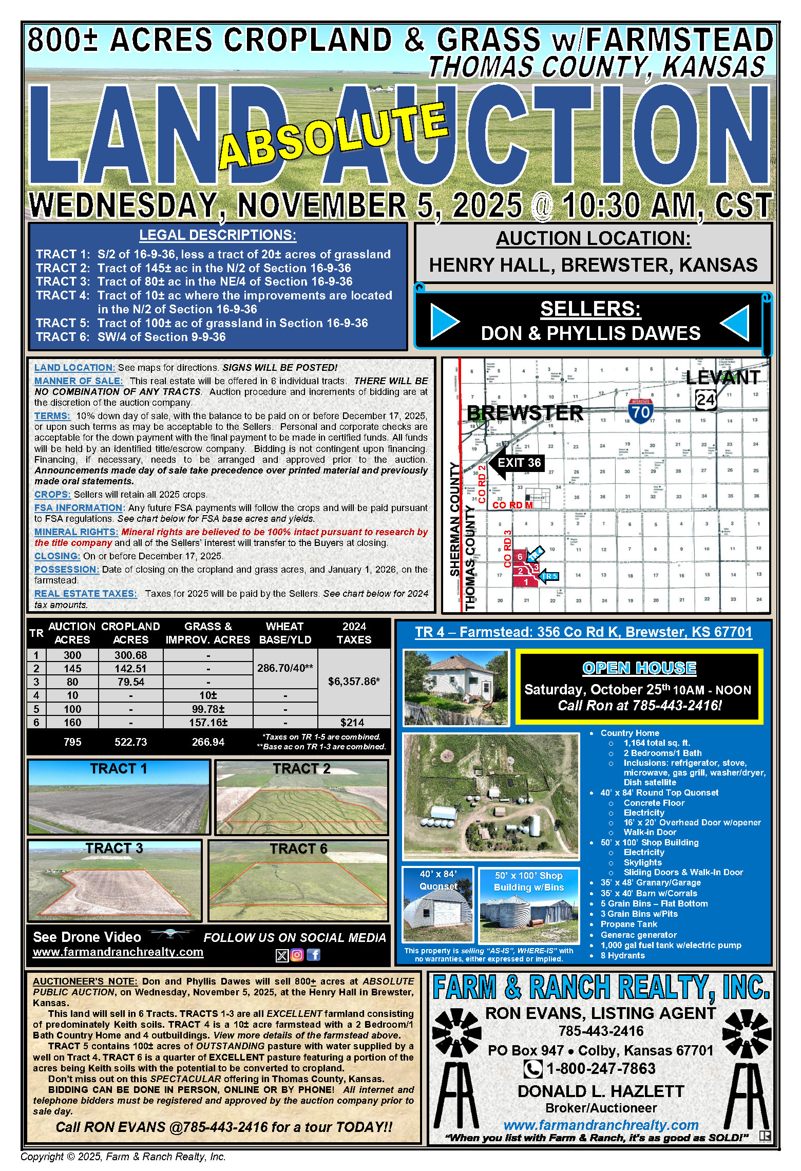 Don and Phyllis Dawes will sell 800+ acres at ABSOLUTE PUBLIC AUCTION, on Wednesday, November 5, 2025, at the Henry Hall in Brewster, Kansas.