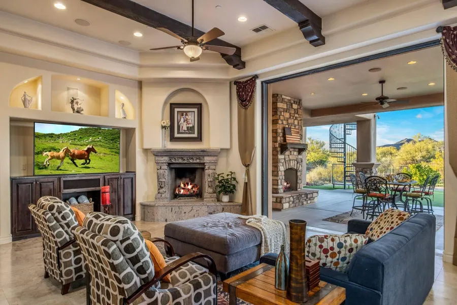 Set on 4.3 private acres in a premier location, this gated estate offers exceptional privacy w/sweeping desert & mountain views. A gated entry and pavered drive lead to a four car garage and fenced courtyard. Inside, soaring 14' ceilings frame a well designed split floor plan with refined architectural details and clear pride of ownership. The home features five bedrooms, five full baths, two half baths, an office, theater room, wet bar, and wine cellar. The kitchen is equipped with high end appliances and an oversized island ideal for entertaining. Expansive glass sliders open to a covered patio with fireplace, pool, and spa. Enjoy Arizona sunrises and sunsets from the rooftop deck. Located in the horse friendly Pinnacle Peak Ranchos community with room to add equestrian amenities.