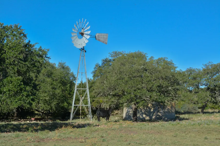 Water: One water well with windmill and concrete reservoir that overflows into small pond.