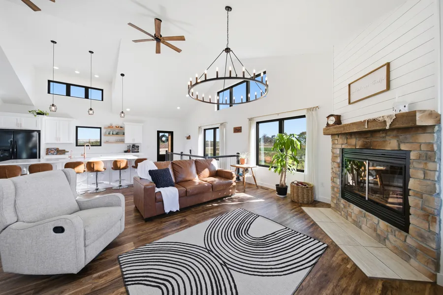 Interior Features: Quality craftsmanship and practical design define the interior. Durable luxury vinyl plank flooring extends through the main living areas, complemented by a large kitchen island, matte black appliances and range hood, and white, soft-close cabinetry. The wood-burning fireplace serves as a warm focal point, while the open layout supports both everyday living and entertaining. Carpeted areas include a waterproof underlayment for added durability and stain resistance.