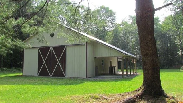 This 81.10 acre parcel includes a 32 x 44 pole barn that has been used as a family gathering place and could easily be converted into a finished camp or hunting lodge. The barn features an open floorplan on the first floor with a spacious loft. The loft and much of the first floor interior has been finished with knotty pine and includes a bar and gathering area. A concrete patio off the back could be used for outdoor gatherings or for storage. In addition, a deck extends off back, accessed by the second floor loft. The building has a single bathroom and and uses a cistern system for gathering water. A septic system has also been installed and the building uses a generator for electricity.