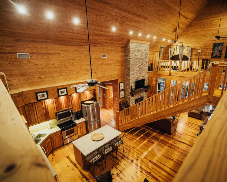 The word that comes to mind when you step inside the cabin is detail. The vaulted ceilings, walls, and floors on the main level are hand-selected cypress and heart-of-pine wood. The fireplace encompasses the entire height of the vaulted ceilings and offers a comfortable setting to relax and unwind.