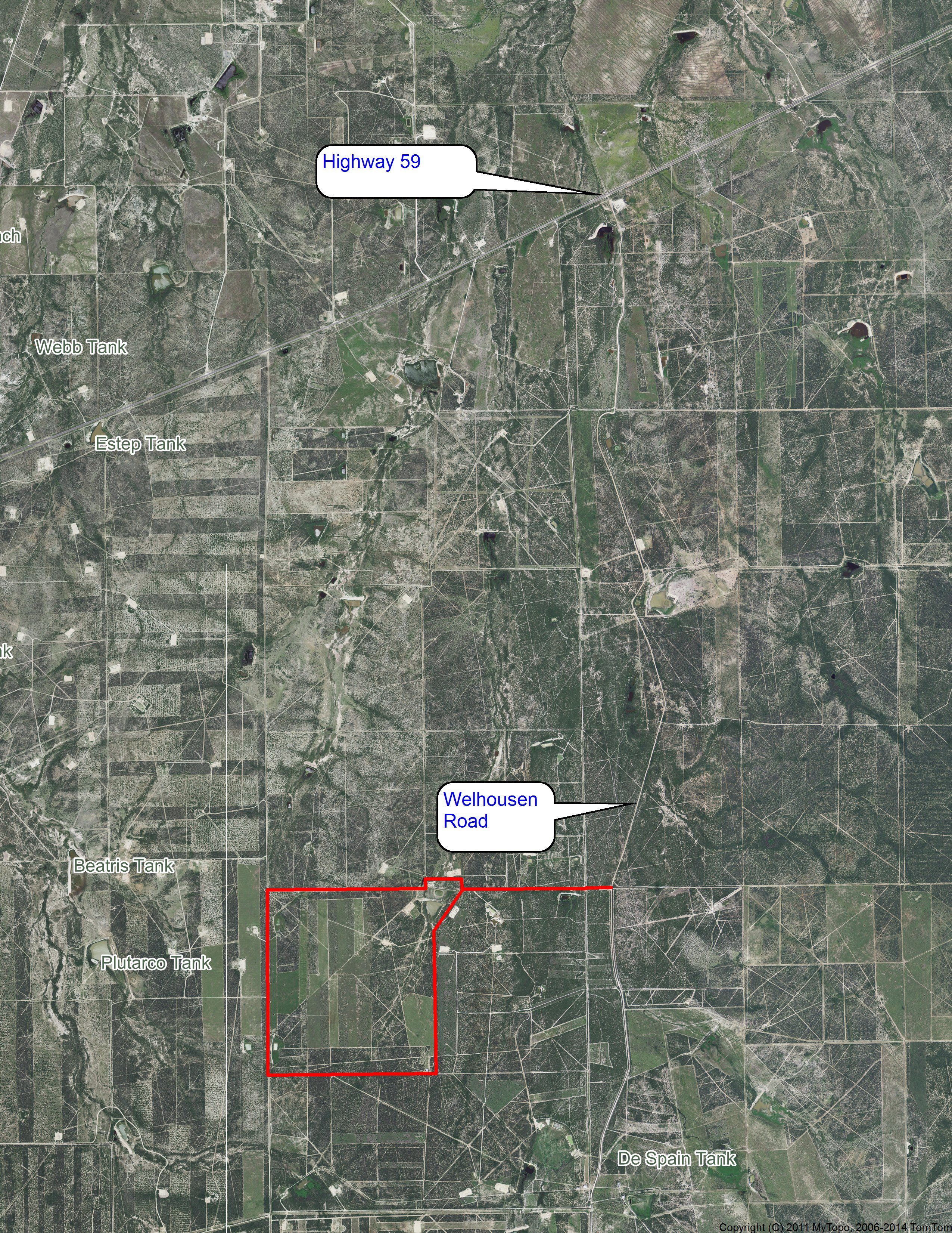 Location: The ranch is about 25 miles southwest of Freer or 25 miles northeast of Laredo, South of Hwy. 59. From Hwy. 59 take Welhousen Road (a county road) about 5 miles to an easement to the ranch. Easement is about 8/10ths of a mile long and in great shape.