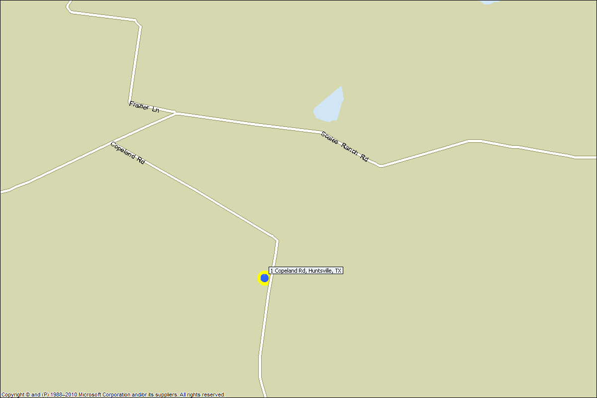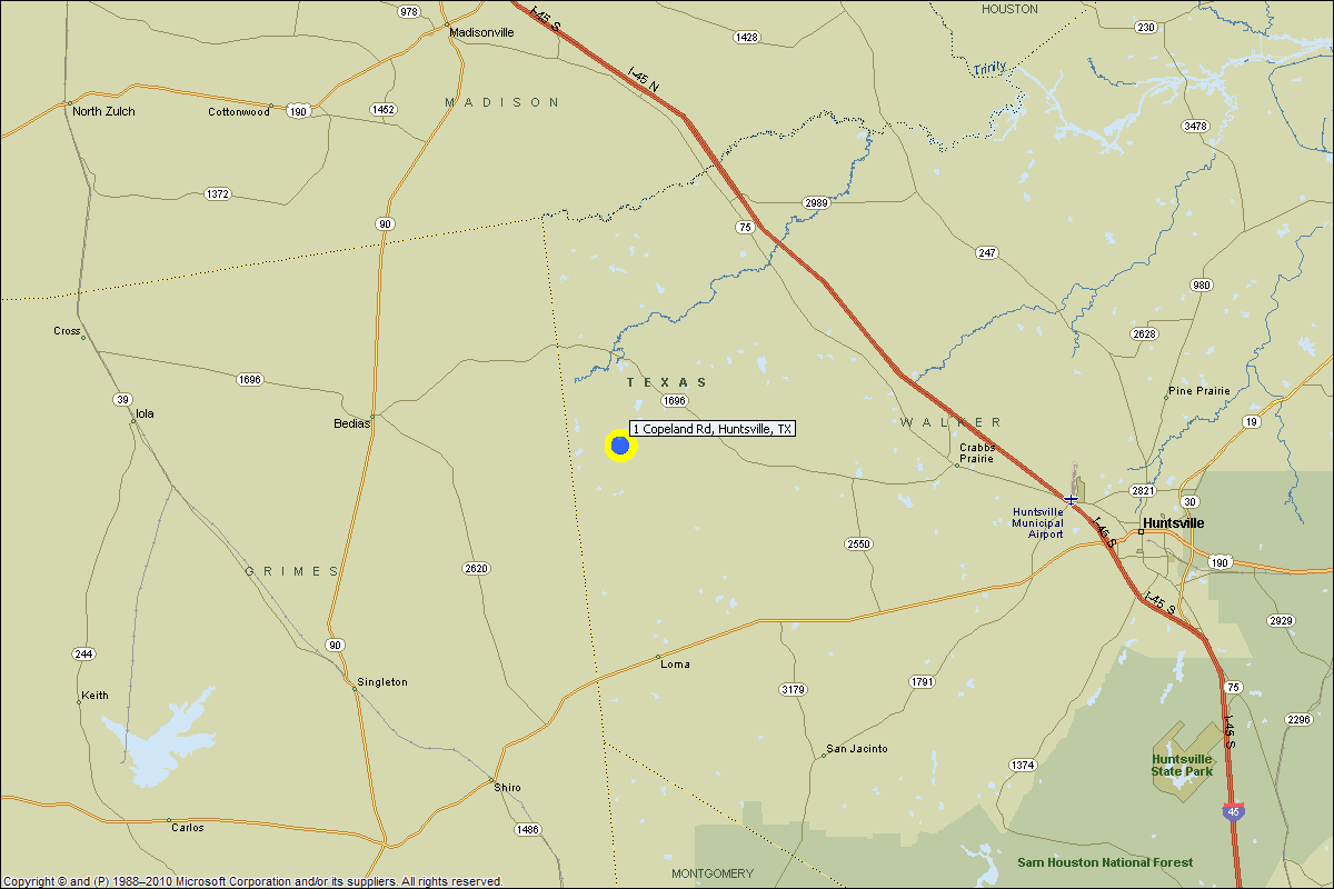 Research Parcel InformationNorth of Huntsville on I-45 take Exit No. 123, (FM 1696), turn left and follow for 1 mile to S.H. 75, turn left, follow for 1/2 mile to FM 1696, turn right and follow for 7.4 miles to Scales Ranch Rd., turn left and follow for 4.2 miles to Copeland Rd., turn right and follow for 7/10 mile to property on right.