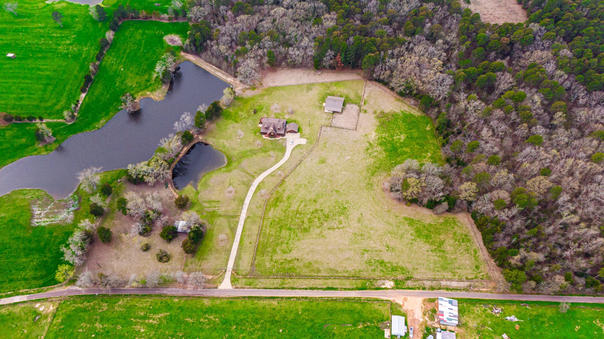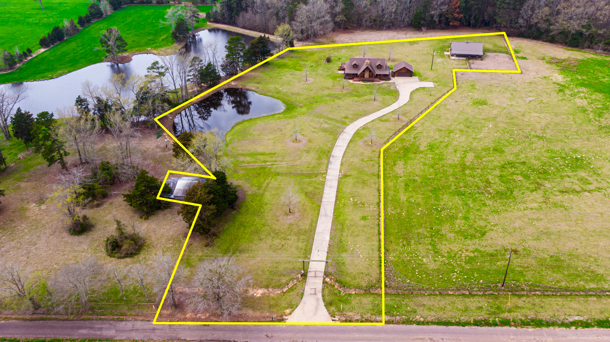 Luxury & Rustic Beauty abound in this 2800 square foot Log Home located on 4.592 Acres in the sought after Harmony ISD. This must-see two story, 4 bedroom, 4 bath Log Home is tucked away in the quiet and serene beauty of rural East Texas. If you love entertaining or spending time outdoors, this stunning gem is just waiting for you to call it home. When you enter the front doors, the large vaulted ceilings open up to the kitchen, dining and second floor. The home features a breathtaking custom stone fireplace, spacious kitchen with double ovens, propane stove top, granite counter tops and wood floors throughout. All 4 bedrooms have en-suite baths. The exterior of the home has wrap around covered porches, perfect for sitting and enjoying the rural setting and gorgeous sunsets. The home features a Generac generator that runs the entire home if power is out. The detached two car garage includes a half bath. There is a metal shop/man cave with overhangs. It is roughed in for plumbing for sink/bar area and features plenty of storage and two horse stalls. The remainder of the property features small pond, pipe fencing with automatic gate and concrete driveway.