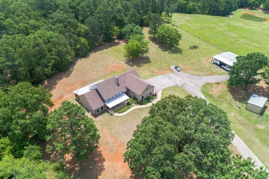 This open concept 4bed-4bath-2-story stone-sided home on prox 58+picturesque acres located near Edom. Terrain is heavily wooded for amazing privacy, with some open areas & more scattered trees around the home. Home boasts engineered post-tension slab, Insulated Concrete exterior walls, Tornado-safe room w concrete walls & ceiling. Heatilator WBFP. Screened-in porch & outdoor kitchen. Sprinkled yard, 2-car garage +1-utility vehicle garage, 40x30ft Shop w elec & 40x10ft storage overhang. 15x25ft utility bldg. 15x25ft loafing shed. Small pond on north side of property. Prop also available with the home and prox 12.4 acres-see prvt remarks. Drone Video, aerial, & survey attached!