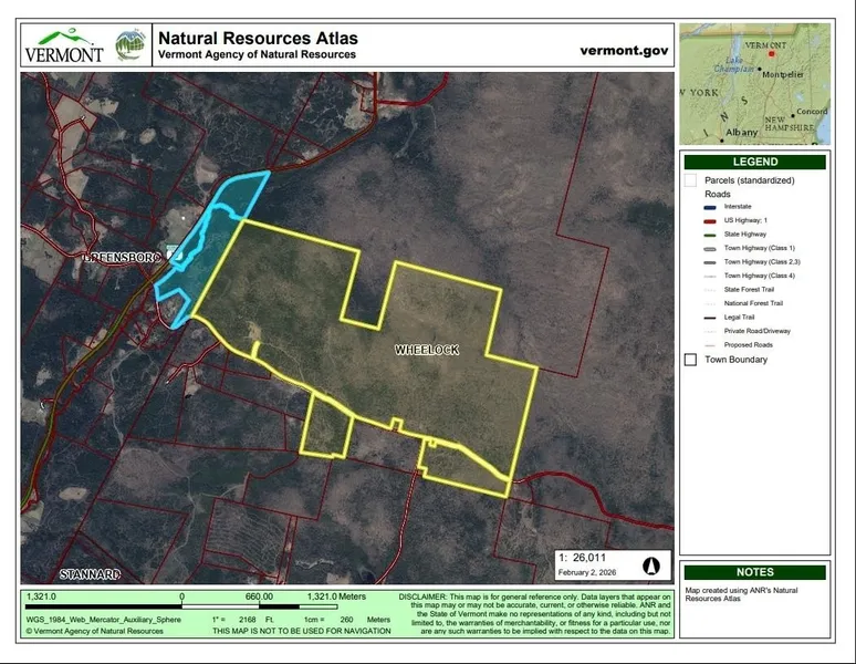 Wonderful opportunity to own a large parcel of Vermont land conveniently located off Route 16 in Greensboro and Wheelock. The property offers road frontage on both Route 16 and Sparrow Hawk Road and is crossed by a snowmobile (VAST) trail, making it ideal for outdoor enthusiasts. The land is protected by a conservation easement and is enrolled in Vermont’s Current Use program, helping to keep property taxes low. Two separate 2-acre parcels have been excluded from the easement. One sits along Sparrow Hawk Road in an open area where a former homesite once existed, offering potential for future use. The second excluded parcel is located further down the road and abuts an older neighboring camp. An additional benefit is an approved exemption allowing for the construction of up to three small seasonal camps on the property. A current forestry management plan is in place and provides valuable insight into the timber composition and long-term stewardship of the land. A rare opportunity for recreation, conservation, and limited development in a peaceful Northeast Kingdom setting.