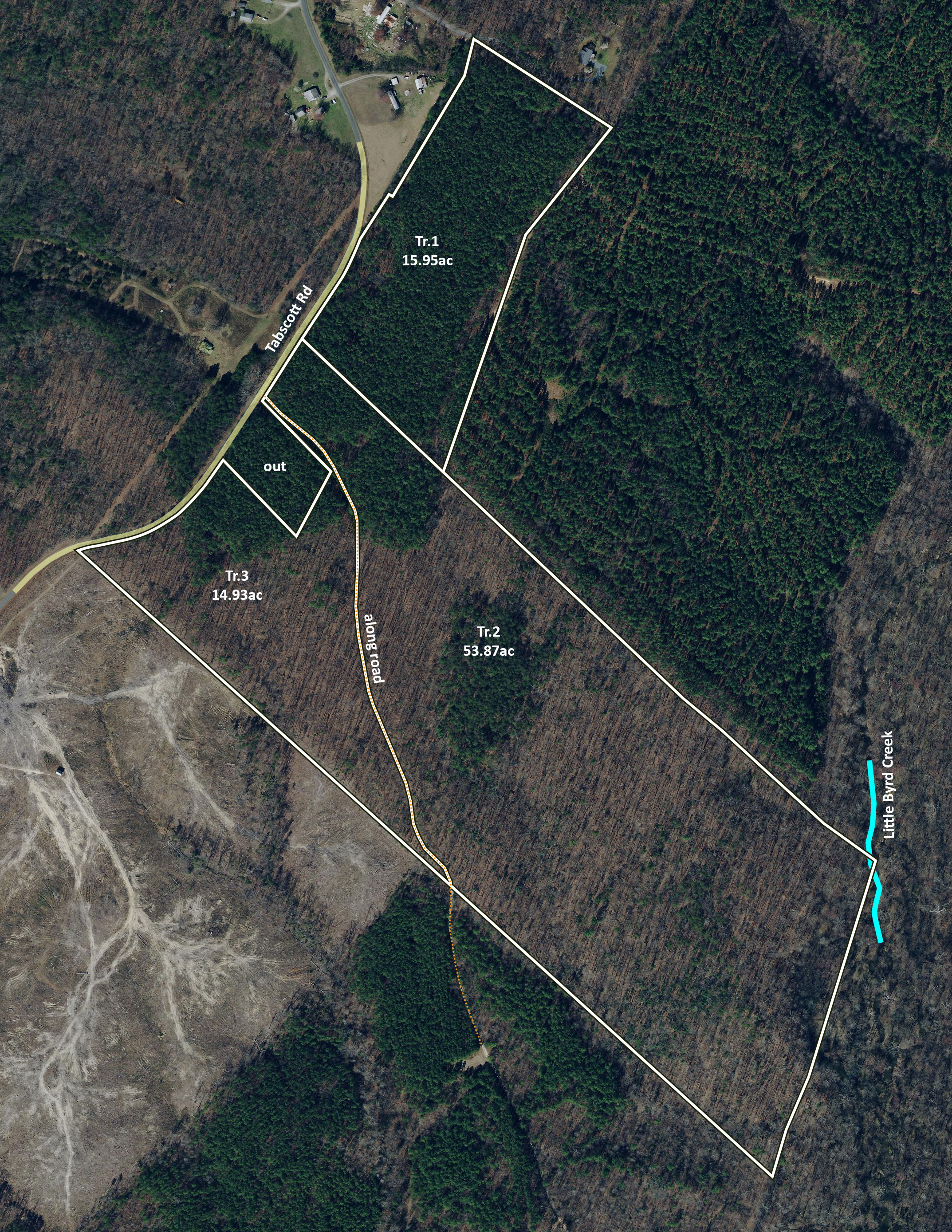 Tract 2: +53.87 Acres (Parcel 17-1-33). Majority in beautiful hardwoods with some mature pine at the front, scenic creeks, and Little Byrd Creek crosses the back corner. 259' of road frontage. Great tract!