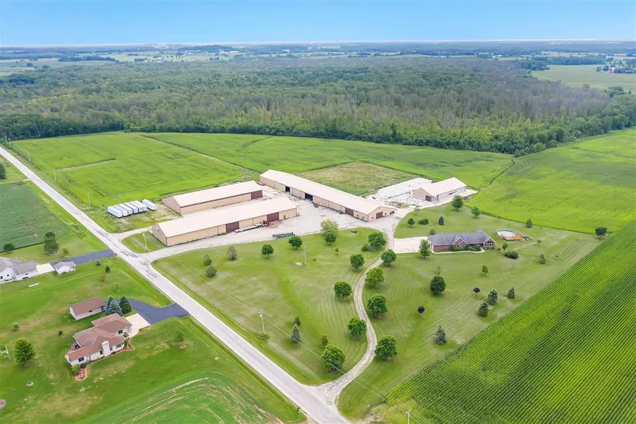 Gorgeous country setting awaits you. Open concept Ranch home built in 2000 with open concept design and finished walkout lower level. Paved & concrete driveway with numerous outbuildings built since 2000. Building 1 - 80x320 which has 60x50 insulated/heated shop, 20x110 covered overhang and rest of building is storage with concrete floors. Building 2 - 80x260 concrete floor storage. Building 3 - 70x190 storage with concrete floor + 25x80 covered overhang. Building 4 - 50x120 Beef barn with drive through feeding & head lockers. (Building sizes approx) Acreage is approx. 39 ag, 36 wooded, 11 Res