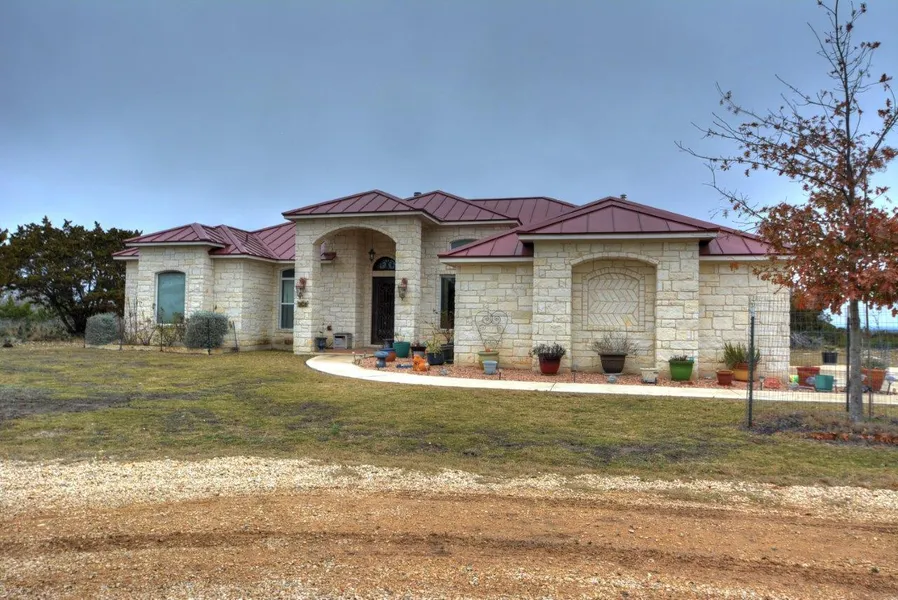 Secure in The Horizon,corner lot, sits this house w/many custom extras. Standing Seam roof, circular drive & built w/Austin Stone. Watch White Tail, Black Buck, Axis, Sika, Fallow Deer & Turkey from your picture window in Kitchen! Stained concrete floors, wired for sound in all rooms, tankless water heater,custom steel front door,kitchen island w/gas cooktop, granite counters, Reverse Osmosis, prep sink, double ovens,warming oven, black granite double sinks. 500gal propane tank, Mst bath: large his & hers walkin closets,whirlpool tub,walkin shower,double sinks. Three garages: 2attached & 1detached. In garage:a Gun Safe,bolted to floor(place for 14 + w/humidifier) ForSale separate. Deerfeeder w/remote crank feeder(setup & working)& watertank:sold separately Patio:outdoor kitchen w/water