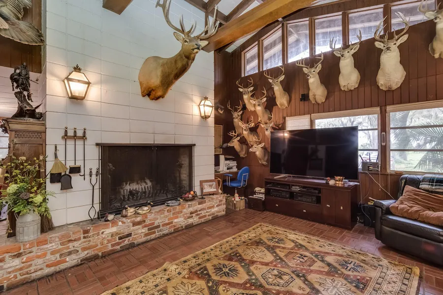 The house/ hunter lodging consists of 3500SF home constructed of cement block with high cathedral ceiling towering fireplace, numerous glass windows viewing the majestic oak hammock surrounding this homesite. Granite counters off the formal dining area, 4 bedrooms/4 baths with some bedrooms capable of holding 4 hunters with their own bathrooms. Grill area on porch off the kitchen and large circular concrete fire pit under oaks at side of home/lodge. Large steel equipment barn and extra barn with walk-in cooler. Equipment list of tractor/ implements to be provided within 10 days of achieving a bilateral purchase contract on the ranch.
