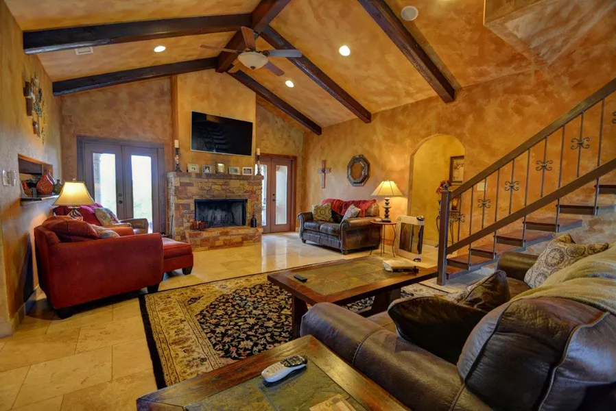 Beautifully Designed Mediterranean/Tuscany Home sitting on 2.81 Acres With Exceptional Views. This Is An Absolute MUST SEE! This home has a striking entry with Travertine tile floors & stone columns, open living area with stone fire place. The recessed ceilings & faux finish adds elegance & style to the formal dining room that offers its own wine storage with wood tiered wine case. The kitchen has beautiful Granite counters with stainless steel sinks & appliances & custom cabinets. Outside is great for entertaining with its own fire place & cooking area. Very family friendly with Media Room, Gym Room, large 3 car Garage, upstairs covered Veranda with extraordinary views and an additional private room great for an second office or play room. The Master Bed Room Is large a spacious with an luxurious Master Bath, granite his & her vanities, walk in stone shower, & over sized jetted tub. There is also a large room upstairs that is an private office.