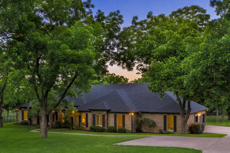 Finely crafted custom built home with matching out-buildings situated on 4+ acres featuring mature pecan trees. The residence provides 12' ceilings with glazed beams, distressed oak finished wood floors, custom glazed oak cabinets and gourmet kitchen. The open design creates a wealth of entertaining possibilities. The 30x40 Workshop includes 12' walls with vaulted ceiling, electric winch with full access, and separate heating and air. The unattached Guest house includes bath and storage space.