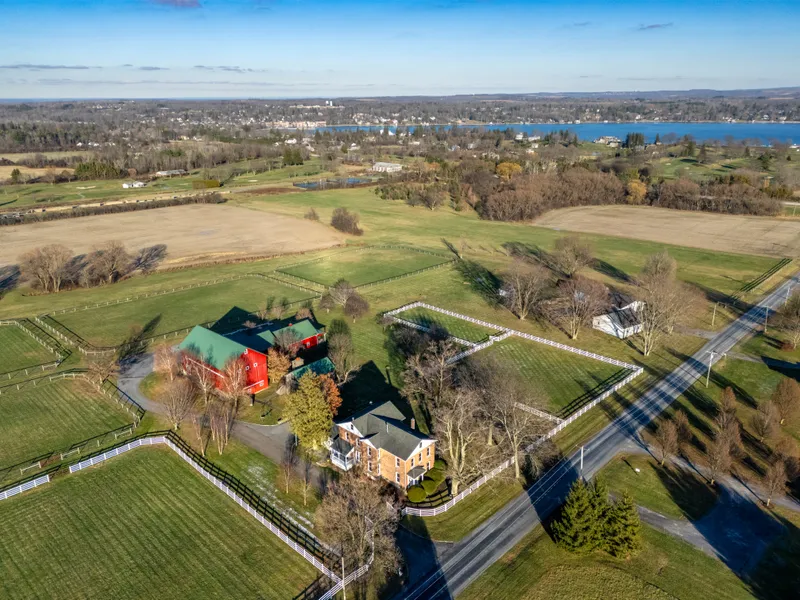 Welcome to this breathtaking 11.78 acres nestled alongside the renowned Skaneateles Polo Fields. This exceptional estate offers unparalleled privacy and charm, with the added luxury of being part of one of the area’s most prestigious equestrian locales. Enter the stately white-gated drive, where you’ll be greeted by a beautifully preserved 1869 brick residence. Spanning 3,696 square feet, the home showcases 6 spacious bedrooms, 3 full baths, and an array of exquisite woodwork and intricate architectural details throughout. Adjacent to the main residence is a charming guest house or in-law suite. The main level features a full kitchen and cozy living area complete with a stacked stone fireplace, while the upstairs offers a serene bedroom and en-suite bath. Outside, a private outdoor space with its own stacked stone fireplace provides an idyllic setting to enjoy stunning lake views—perfect...