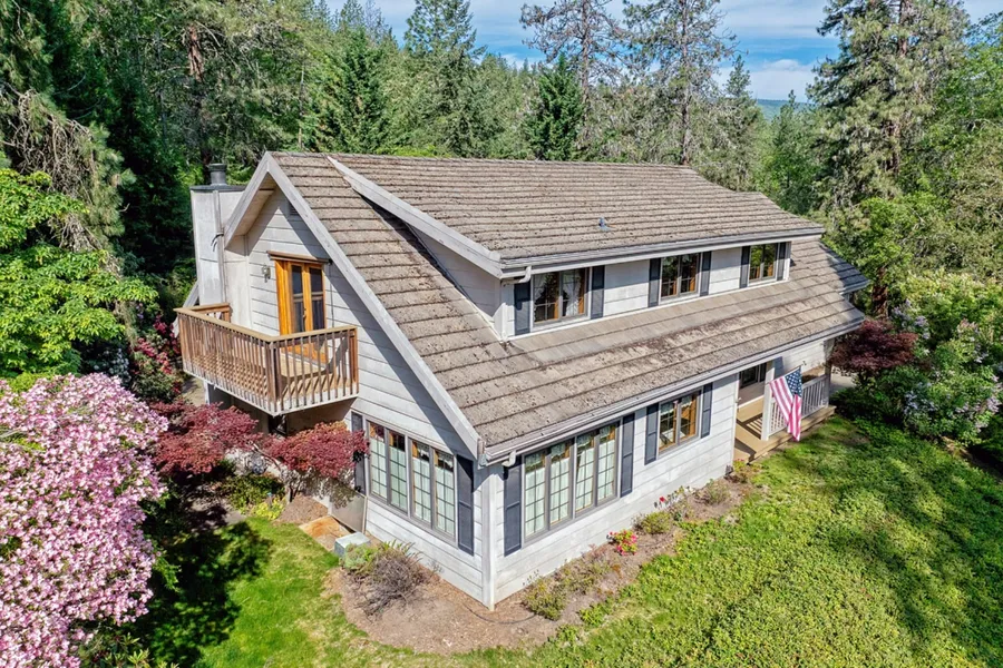 Just outside the heart of Jacksonville, this beautifully maintained 2 level home offers space, charm, and privacy on a security gated and fully fenced 1.18-acre lot. A private drive welcomes you with blooming trees & lush landscaping, the grounds equipped w/drip & sprinkler irrigation systems for low-maintenance care. With 2,478 sq ft, this 4-bedroom, 2-bath home features a flexible layout, including 2 bedrooms on the main level. Upstairs, enjoy a spacious primary suite with pine plank ceilings, custom lines, a generous walk-in closet, large bath, plus an additional guest room and a large walk-in attic with potential for future living space. The light-filled living room offers wall-to-wall windows showcasing the peaceful setting, while hardwood floors and a cozy wood-burning/gas fireplace add warmth. An open-concept kitchen is perfect for entertaining. Additional highlights include public utilities, oversized 2-car garage, RV parking, and vegetable garden with orchard. A rare find!