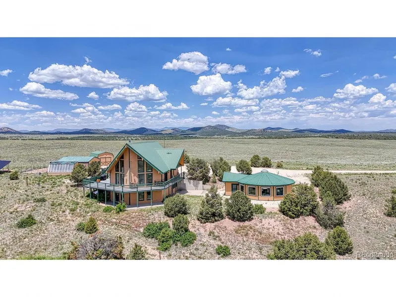 Experience Unmatched Colorado Mountain Living with a View from Every Angle Discover 38 acres of pure mountain magic in this exquisite 3-bedroom, 3.5-bath chalet-style retreat-complete with a fully remodeled luxury yurt-perched high on a hilltop with panoramic 360 views of the valley below, the dramatic Sangre de Cristo Mountains, and sunsets that will leave you breathless. From the moment you enter, soaring vaulted tongue-and-groove ceilings and floor-to-ceiling windows flood the great room with natural light, framing postcard-worthy scenery in every season. A wood stove offers cozy warmth for crisp Colorado nights, while the open flow makes this the perfect space for both quiet evenings and lively gatherings. Just off the entry, a small sitting room welcomes guests and offers a quiet spot to read or relax. Upstairs, a lofted living area overlooks the great room and features two spacious bedrooms, a full bath, and a generous common space-ideal for a lounge, media area, or creative nook. The walk-out basement adds even more flexibility, with a huge bedroom, a versatile multipurpose area for an office or crafts, a full bath, and an oversized laundry/utility room. The fully remodeled yurt is a showstopper-offering an open floor plan with skylights, a full granite-counter kitchen, dining space, room for a bedroom, and a stylish 3/4 bath. Whether you use it as a guest house, in-law suite, artist's studio, or the ultimate she-shed/he-shed, it's a space that will delight everyone who steps inside. Outdoor living is equally impressive, with a wrap-around deck for soaking in the views, a detached garage, and a greenhouse for year-round gardening. Solar power enhances your self-sufficient lifestyle, while the property's hilltop perch ensures peace, privacy, and views that inspire every day. This isn't just a home-it's an experience. A rare blend of luxury, flexibility, and mountain serenity, waiting for you to make it your own. Schedule your private showing today and step into the Colorado lifestyle you've always imagined.