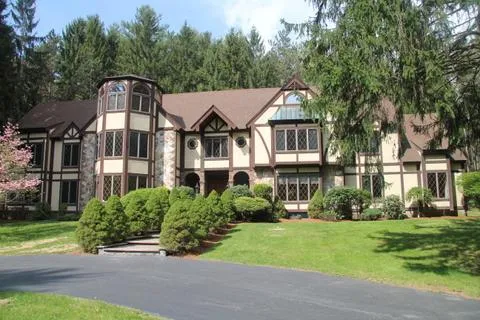 SPECTACULAR 9 ACRE ESTATE ~~RACQUET AND SWIM CLUB~~Long private lane leads to this very beautiful and stately 8500 sq. ft. country Tudor with indoor pool, spa and entertainment center. Surrounded by mature landscaped grounds, towering pines, and great neighboring properties. Offering 6-7 bedrooms, 5.5 baths, family room with fireplace and wet bar, formal dining