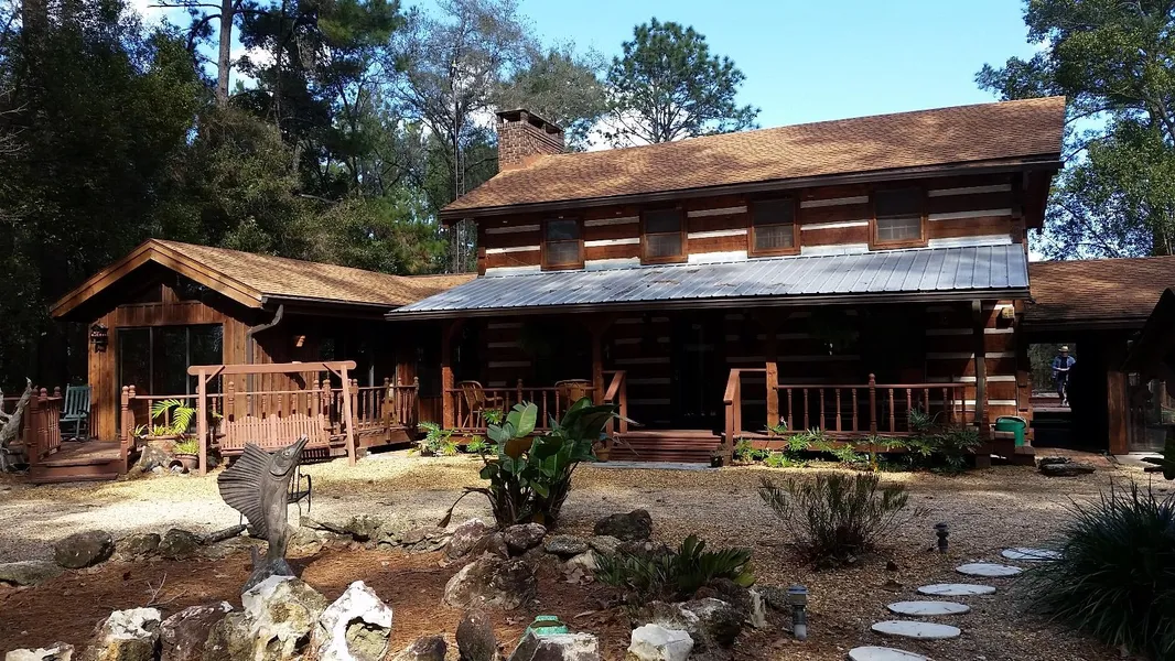 This is a one of a kind retreat that boast a 5BR/3BA log home located on beautiful Cowpen Lake & Ray Lake. Master bedroom has wood-burning brick fireplace. 2 bedrooms & 1 bath are located in the full basement that has a living room w/wood-burning brick fireplace. It is a must see. While sitting on the huge deck, you'll feel like you are in the hills of north Georgia. There is an awesome game room, 3-car carport, detached garage, greenhouse, storage building, & the list goes on for what this property has to offer. The guest cottage is beautifully done with a bedroom, bath, living room w/wood-burning brick fireplace, kitchen & dining area. Pines, palms, azaleas & ferns are located throughout the property.