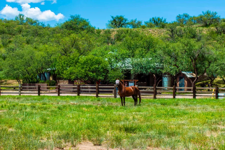 WolfNest Ranch has it all. This rural 9.4 acres is in the heart of historic western movie country; Tucked into a snug wind-tame Rincon with dynamic south-easterly views of the Sky Island Mountain Empire. Four equal seasons at 4200 ft. Elev. ... hot summers (not too & dry), greatly welcome monsoons, slightly chill winters (a touch of snow). Just a few cacti! The lg. pole barn features an 8' by 16' tack & feed room, a matted service alley & 16' by 18' birthing stall, a sheltered feeding lane with two large adjacent holding stalls, solar lighting & a hydrant fed stock tank. The 16' by 16' elevated hay barn features a rubber bumpered loading dock and flood lighting. The barn complex abuts an estimated one acre pasture with a 4-plank & RR-Tie fence that has 12 gates and a 12' by 24' pole shed to greet & safeguard guest horses. The second acre-sized (very wooded) pasture features a 60' paneled...
