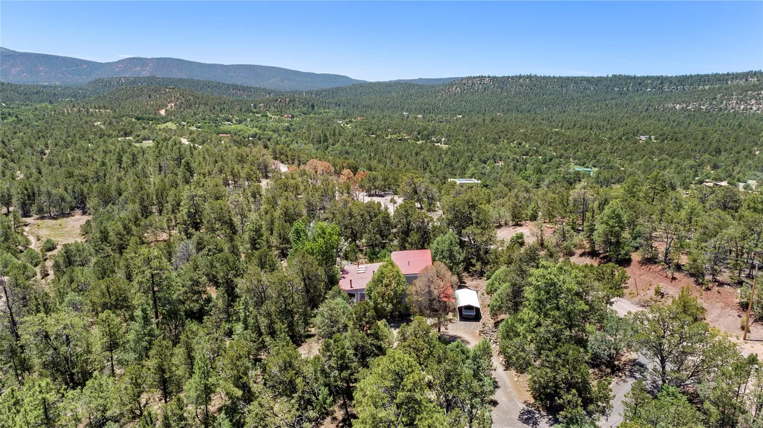 Charming country retreat nestled in the forest with piñon, juniper, oak, ponderosa and cottonwood trees, wildflowers, bushes and rock outcroppings. The 2 bedroom, 3 bathroom main house is comfortable, cheerful and welcoming with multiple living areas for privacy as well as family activities. The gracious kitchen offers ample countertops and cabinetry and a dining area sits adjacent. Lots of windows and skylights brighten the 2,087 square feet and there are several doors for easy outside access to the 3 decks for outdoor living. The upstairs bedroom suite loft is spacious with adjoining office or sitting area. Also included is a sunroom perfect for indoor plants. The cozy, rustic 1 bedroom, 1 bathroom 240 sf guest house cabin with its own gated driveway offers possible additional income or a place for friends and family to stay. The property’s 9.63 acres provides privacy with lots of wild...