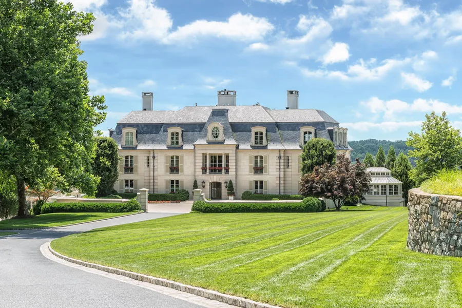 Sited at the top of a gentle knoll on the banks of the Potomac River sits an elegant chteau clad in French limestone. This mansion was the formal estate of Jordans King Hussein and Queen Noor. The main parcel and structure were acquired from the King & Queen in 2000. Subsequently, the owner has thoughtfully acquired six adjacent parcels furthering to beautify and expand this grand and private 15-acre riverfront parcel. The estate is a collaboration between renowned architect, John Ike, designer, Geoffrey Bradfield, and Horizon Builders. The three worked effortlessly together to create this impressive four-story mansion constructed with French milled limestone and a slate Mansard roof punctuated with limestone dormers.The entry to the property is through gates set seamlessly into the limestone columns of the front wall and flanked by gas lanterns. The gates open to a verdant half-mile dri...