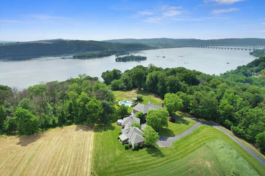 With majestic views of the Susquehanna River, this unique and secluded 9.7-acre estate includes a main residence that has nearly 8,000 square feet of living space and a separate three bedroom, two and a half bath home for guests or family members of every generation. Bordered by farmland and wooded areas, the property provides peace and tranquility. A private driveway leads to a stately portico on the main house. Inside the four bedroom, five and a half bath custom home there are fine features throughout. The tiled two-story entry is inviting with a designer chandelier and an elegant wood double staircase. A large great room makes for grand entertaining. Highlighting the formal dining room is a hand painted mural displaying the four seasons of the year. To be appreciated is the Chef’s Kitchen with a breakfast nook that opens to the back patio. Completing the main house is a finished dayl...