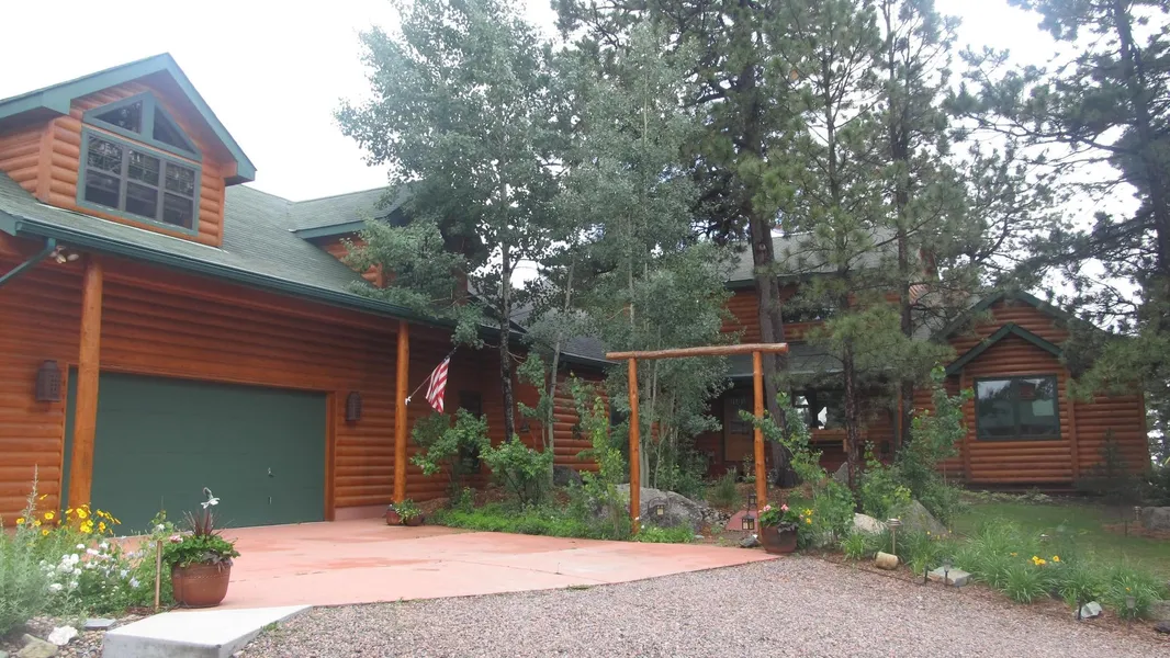 Gorgeous log sided home on beautifully managed 10 acre treed parcel in the Black Forest. This home offers 2 master suites... One on the main and one on the upper level. The front room is a two story large living room w/ gas fireplace and rich hardwood floors with sub floor radiant heat. The kitchen has ample cabinet space and island. A decorative Keva style gas fireplace creates great ambiance in the dining area. The Marvin windows let in an abundance of natural light. As you move through the home, you'll notice that the there is interior log siding, custom doors, artful lighting and stained glass. The original house was built in 1995. In 2001, the addition was added. This creates a fabulous space for a family room with a wood stove and dry bar. Just off the family room is a half bath with a vessle sink and custom vanity. As you head upstairs, you enter a spacious and inviting master suite. The bath has a granite vanity with an under mounted sink , stand alone shower soaking tub and custom windows with beautiful views of the forest. You can move through the large walk through closet into the bedroom with custom ceiling fan, office space and reading nook. The attached garage is dry walled and heated. There is an additional 720 sq. ft. heated 2x6 constructed detached garage/workshop with an epoxy floor, and wired for 220 as well as multiple outlets. Outside, there is a 420 sq. ft. deck with decorative lighting and adjoining enclosed hot tub. Enoy the great views of the mountains and the forest while you watch hummingbirds and wildlife in this peaceful and serene setting. custom southwestern lodge style home on 10 beautiful acres with trees and views. Gorgeous landscaping includes custom water feature in front, fenced back yard and fantastic deck. Living room features soaring ceilings and custom stone gas fireplace. Decorative kiva style gas fireplace in dining area. Cozy family room with dry bar and wood stove. Two master suites with designer touches; accent lighting, custom vanities, glass block showers in bathrooms.